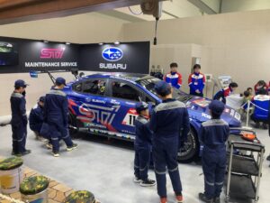 子供たちが各メーカーのツナギを着て、メカニック体験。