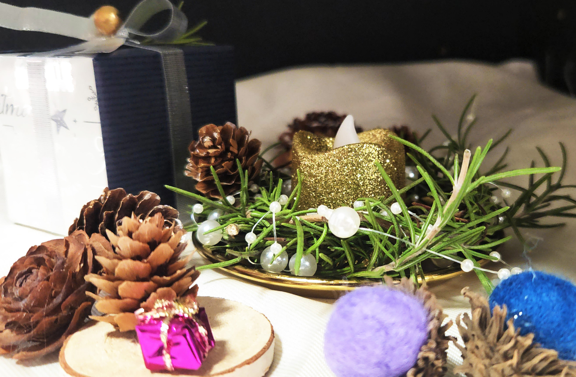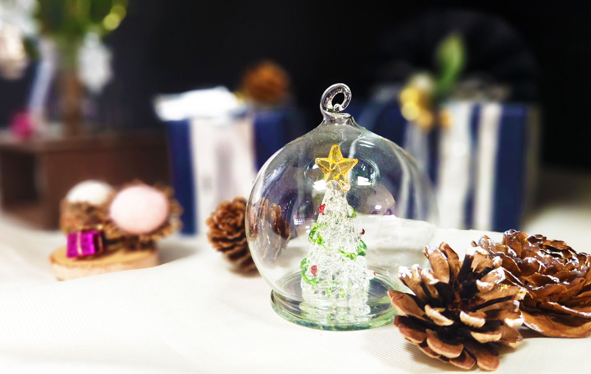 きらきらと輝くゴールドキャンドル、透明感あふれるガラスのツリー、
