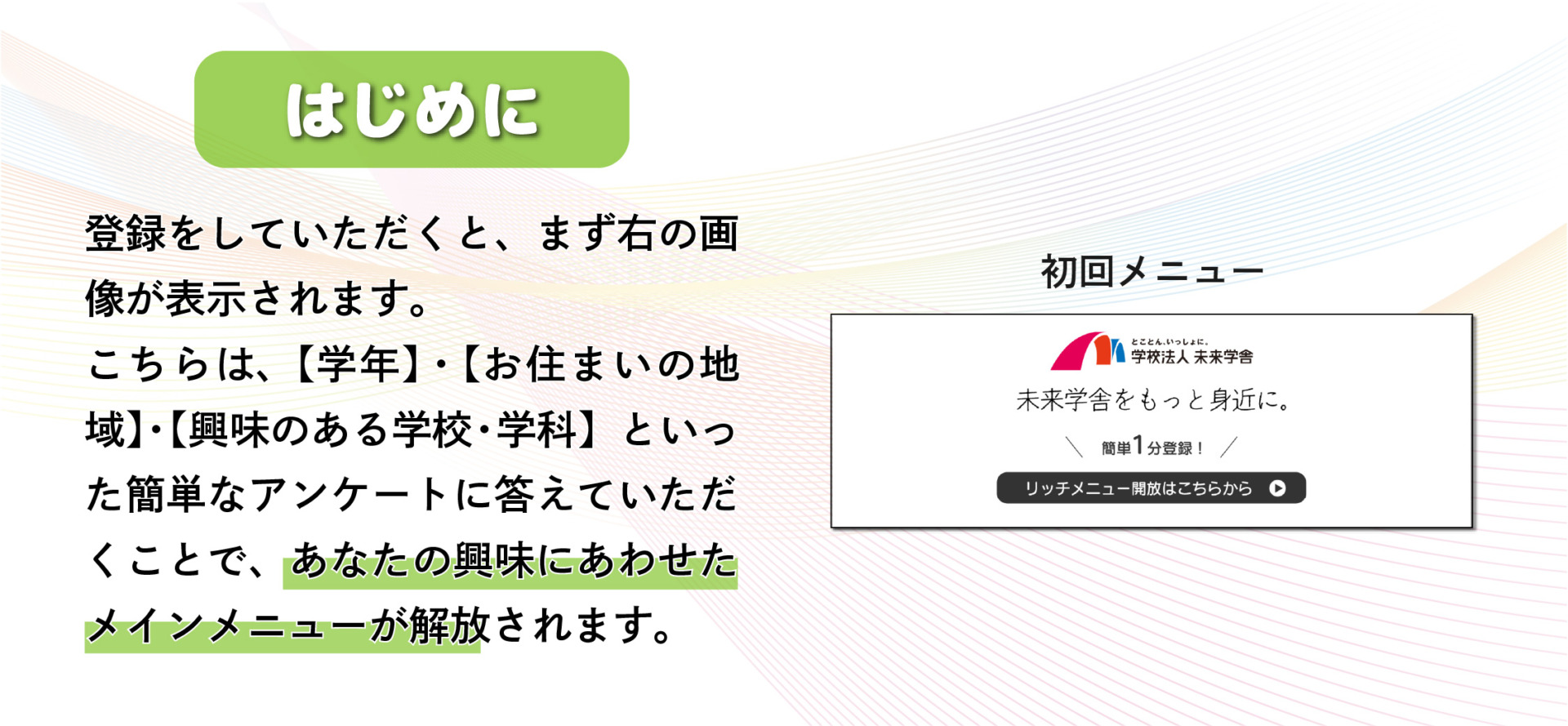 設定は、友だち追加後、初回メニューをタップし「初回アンケート」で学校を選択。